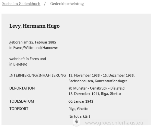 Am 13. Dezember 1941 wurden beide Ehepartner mit dem Transport Münster – Osnabrück – Bielefeld ins von der deutschen Wehrmacht besetzte Riga (Lettland) deportiert.[5] Hermann Levy wurde dort im Januar 1943 ermordet.