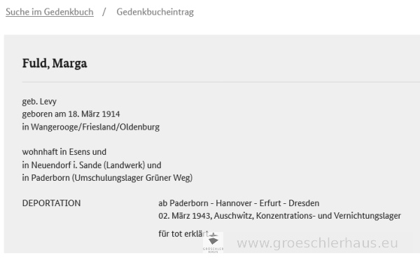 „Häftlingspersonalbogen“ Auschwitz für Alwin Fuld, Häftlingsnummer 104923. Arolsen Archives.Einträge im Gedenkbuch Bundesarchiv für Marga Fuld, geborene Levy, und ihren Ehemann Alwin sowie den Sohn Dan.